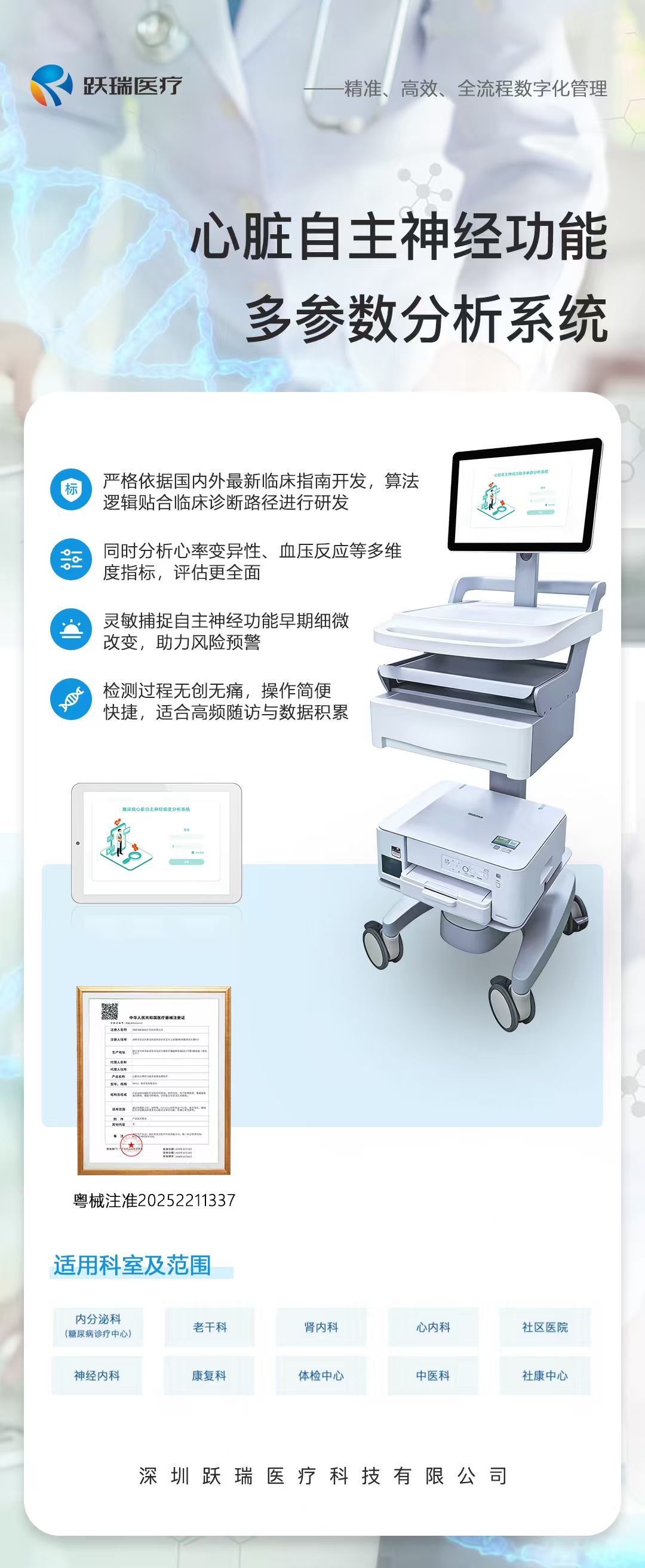 心脏自主神经功能多参数分析系统由深圳跃瑞医疗科技有限公司自主研发,是一款面向临床与健康管理场景的数字化检测设备,严格遵循国内外最新临床指南,以贴合临床诊断路径的算法逻辑,为心脏自主神经功能评估提供全面、精准、无创的解决方案。